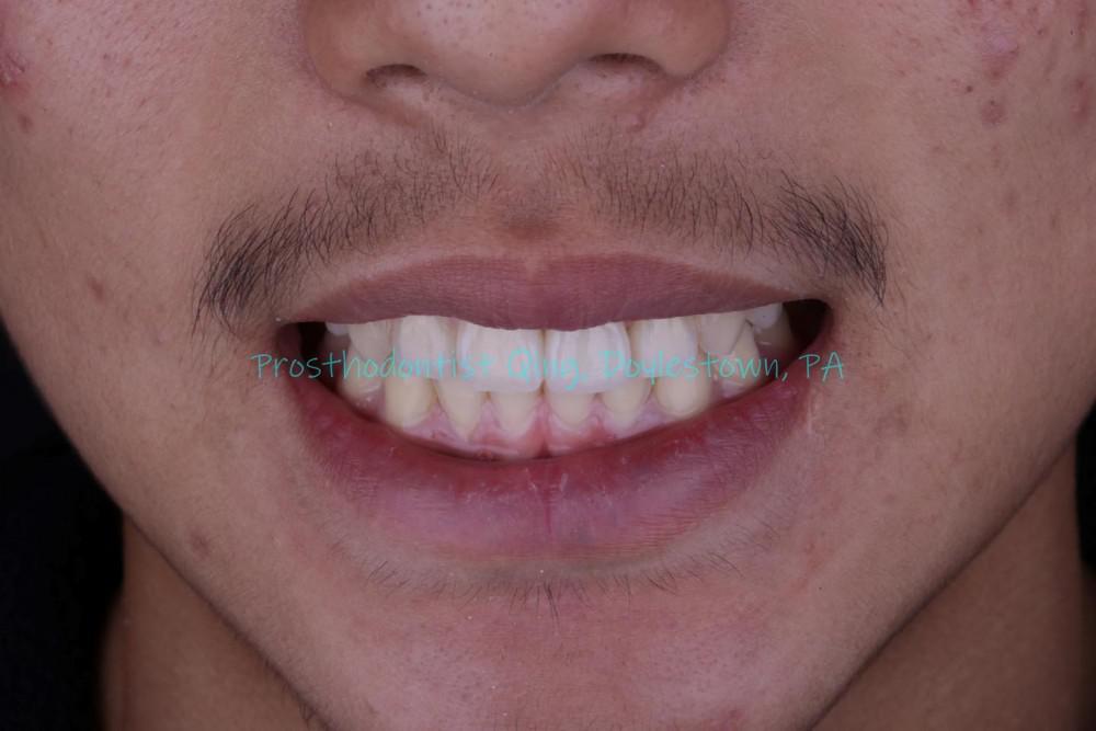 In the old days, dentists many times had to suggest veneering the contralateral central to get a better match and symmetry. With the new technologies, material science, and craftsmanship, Prosthodontist Qing uses porcelain fused to 3-Y zirconia,