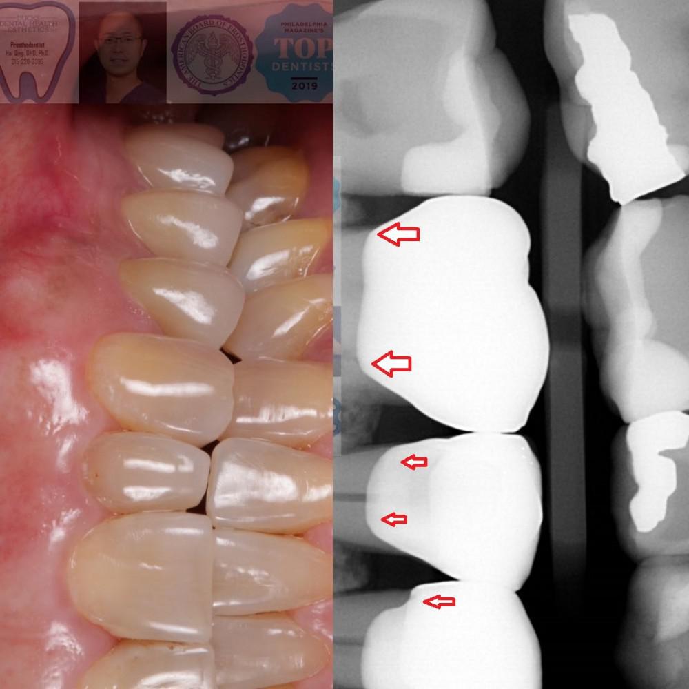 The crowns were then tried to make sure they meet all the Prosthodontics standards before delivery. One of the most important steps is to use a Bitewing Xray to check the marginal seal. ( arrows indicate the perfect seal, no bulky overhang or gap)