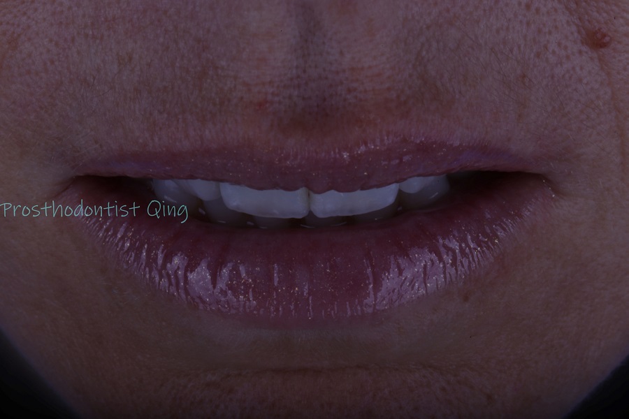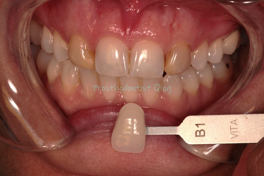 During a comprehensive examination, our prosthodontist Qing discovered two caries underneath the old bonding. We addressed tooth decay as the first step. This is because the health and function of the oral system are always the top priority, even in cosmetic procedures. We also recommended tooth bleaching first to improve the overall shade, followed by conservative tooth preparation to remove the decay and old bonding.