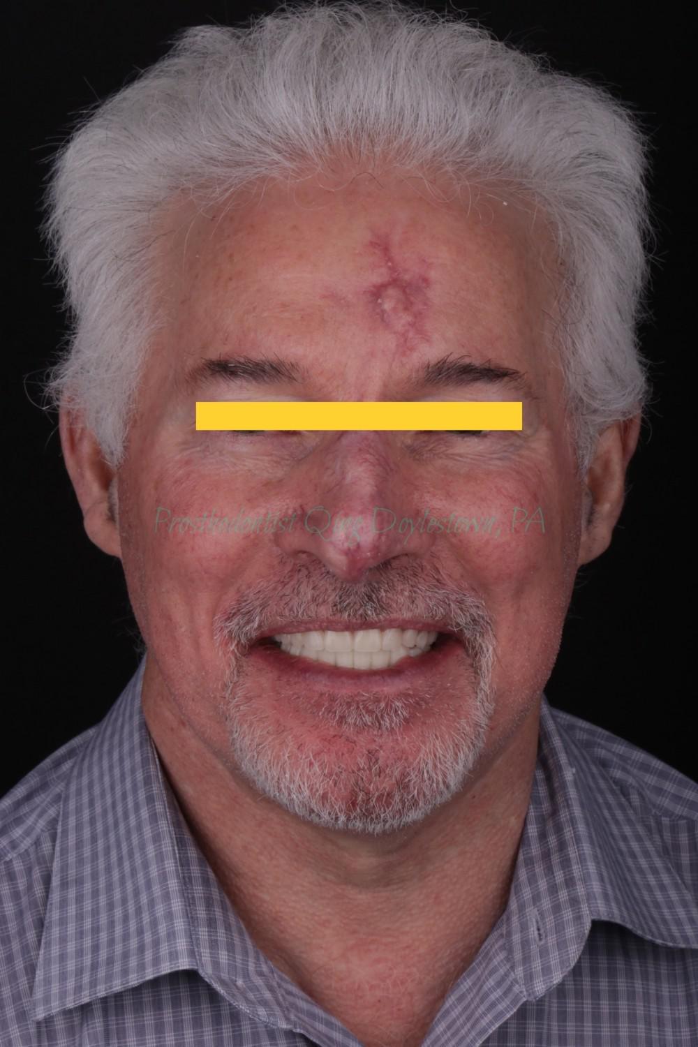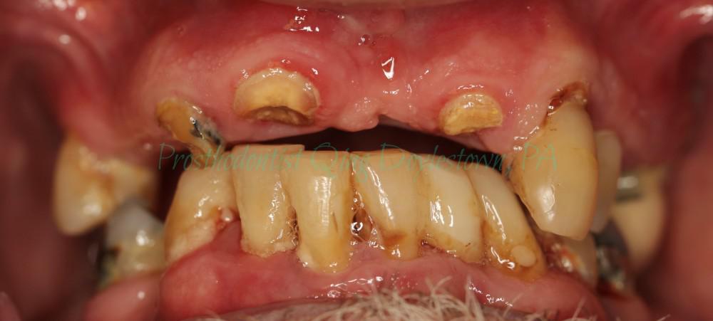 After an accurate diagnosis, thorough periodontal treatment and save all possibly save able teeth, Prosthodontist Qing team accomplished the challenging case by giving the patient functional and esthetics rehabilitation including upper hopeless teeth extraction, immediate complete denture, lower hopeless teeth extraction, periodontal treatment of the gum disease, guided tissue regeneration, and dental bridges.