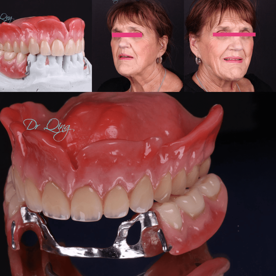 Click the following patient/denture image to See Dr. Qing’s actual patients who received denture treatment. Even a regular denture could be very retentive (see the video) and patients rarely need to use any denture glue.
